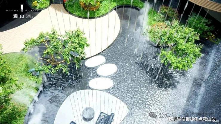 灵动镜面水池如天空之镜,将流云、树影、瀑景悉数倒映,与四周绿植构成天然氧吧。
