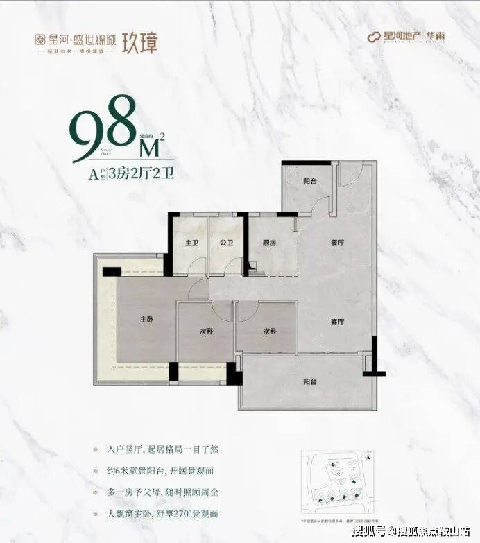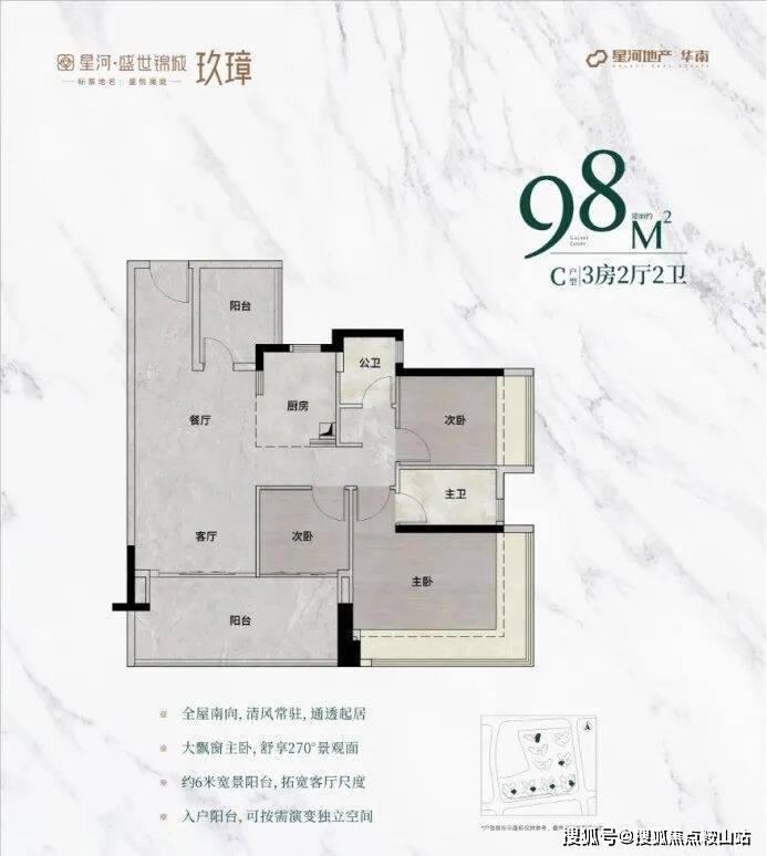 98㎡户型全新升级,主朝向朝南,让阳光洒满每一个角落。主卧配备 270° 无柱飘窗,视野开阔,美景尽收。次卧和阳台尺度大幅增加,提供更加舒适的居住体验,无论是休闲娱乐还是晾晒衣物都更加从容