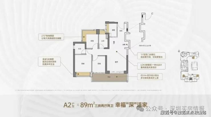 89㎡的3房2厅2卫,A2户型,设计的是竖厅格局,客厅3.5米开间,LDKB一体化,S墙设计预留冰箱卡槽位,客厅连接次卧出5.9米长的大阳台,次卧270度转角飘窗,U型厨房,卫生间干湿分离,阳台有朝西向、东向、南向。