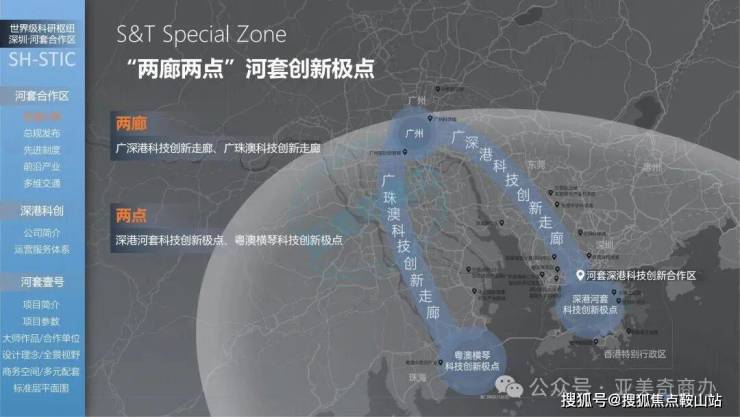 粤港澳重大合作平台、综合性国家科学中心、"两廊两点"架构体系的科技创新极点。合作区位于深圳市福田区南部与