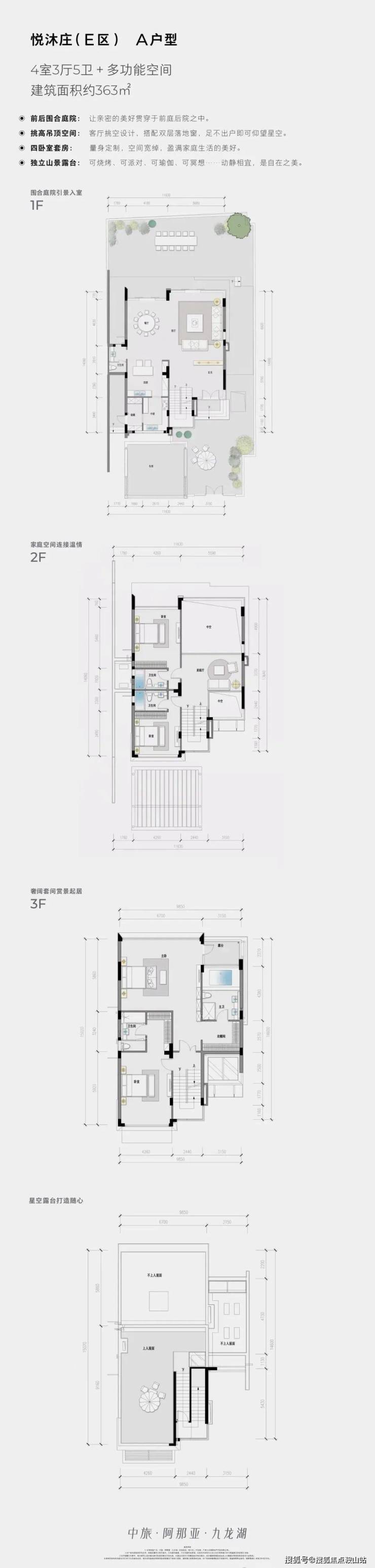 ✮产品面积:A户型(首层)195方-3房3厅4卫,B户型(二层)240方-3房3厅4卫,D户型(顶层)175方-3房3厅4卫,E户型(山景平层)170方-3房2厅3卫
