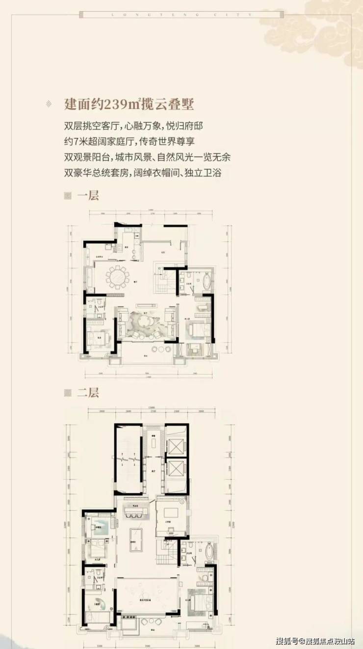 建面约440-837㎡国风院墅(总价约800万-2500万/套),建面约239-255㎡揽云叠墅(总价约500万-600万/套)