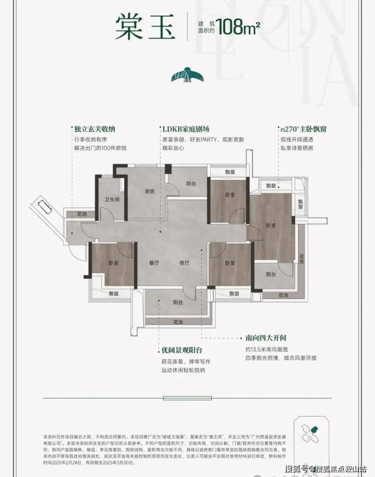 建面105平户型,项目放在了东南单边位,而且是南北对流设计,保证了采光通风,在市场同面积段产品里比较少见,所有房间都有花池、飘窗赠送,主卧还能放下衣帽间,整个户型实际能去到120㎡左右,进门处带了入户花园,可以用来收纳之余,也多了一份仪式感。