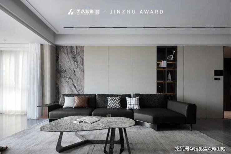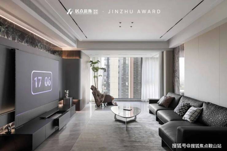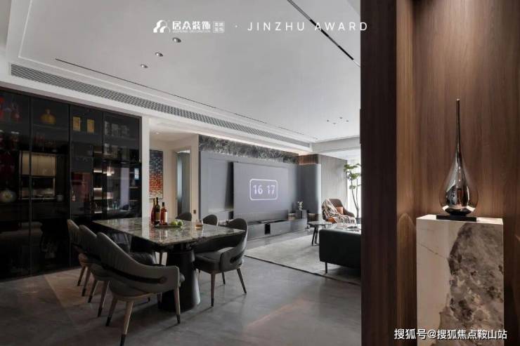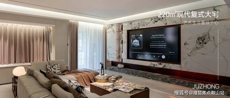 将空间内敛的奢华和神秘发挥到极致的,当属意式轻奢暗黑系。优雅的钢琴黑遇上温暖复古的深棕色,墙面大面积留白,色彩的互补统一增加视觉上的冲击力,凸显质感与层次。岩板与大理石材质错层叠加的悬空电视背景墙,形成丰富饱满的对比;搭配地升幕布,在家也能拥有沉浸式的观影体验。沙发背景墙选用浅色系木饰面与大理石体块拼接,展示柜的穿插介入,让整体空间既有视觉上的美感,又有触觉上的舒适度。