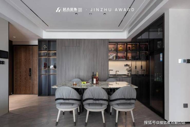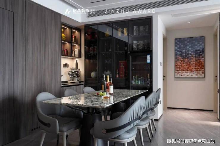 与客厅同处一个整体,餐边柜选用浓郁却不厚重的深邃灰色。通透的玻璃柜嵌入灯带,更具奢感的同时让酒也成为用餐区的装饰品。长型大理石餐桌搭配浅灰色的餐椅,打破了原有的对称性,让空间更加富含个性。