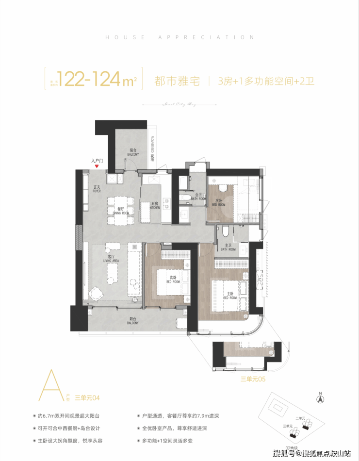 122-124㎡3+1房2厅2卫,有竖厅、横厅和双龙抱珠户型,跟之前03地块户型完全一致。