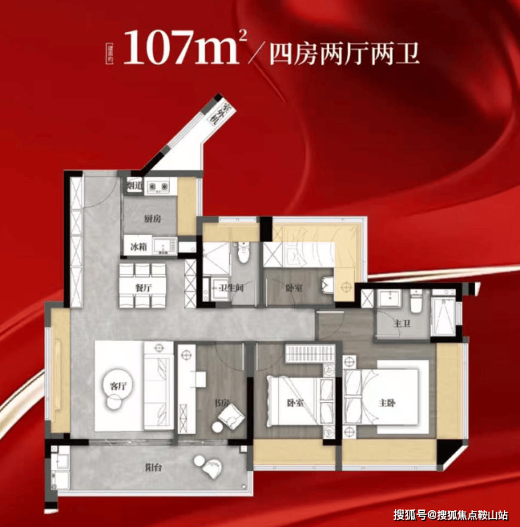 110㎡的4房2厅2卫,设计的是横厅南北通透格局,进门入户玄关,客餐厅6米开间,LDKB一体化,4个卧室分别做到了4.1米/3米/2.5米/2.4米的宽度,主卧套房设计,客厅连接次卧出6.7米长的大阳台,L型厨房,卫生间干湿分离,阳台主朝西南向。