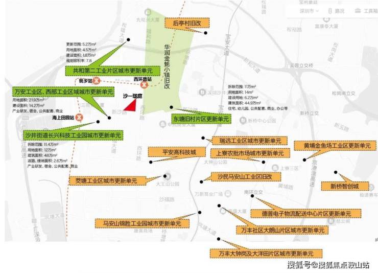 区域内超过29个旧改项目,约400万㎡城市更新,超千亿投资,众多品牌进驻。本项目毗邻华润百万级旧改——金蚝小镇,该项目规划用地范围约3平方公里,相当于3个沙井海岸城体量,4个南山华润城体量,将打造粤港澳大湾区的海洋文化地标,成为深圳西部城市中心