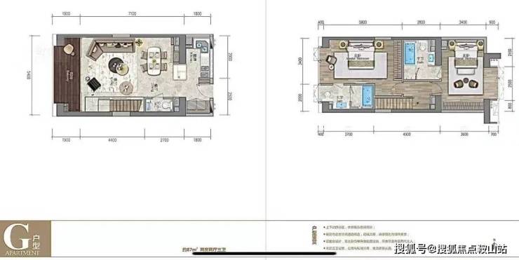 ★88㎡复式两房两厅三卫 双向通透采光,5.4米开间客厅及主卧,双套房周全设计,室内多变空间可根据家庭需要设置独特的功能。