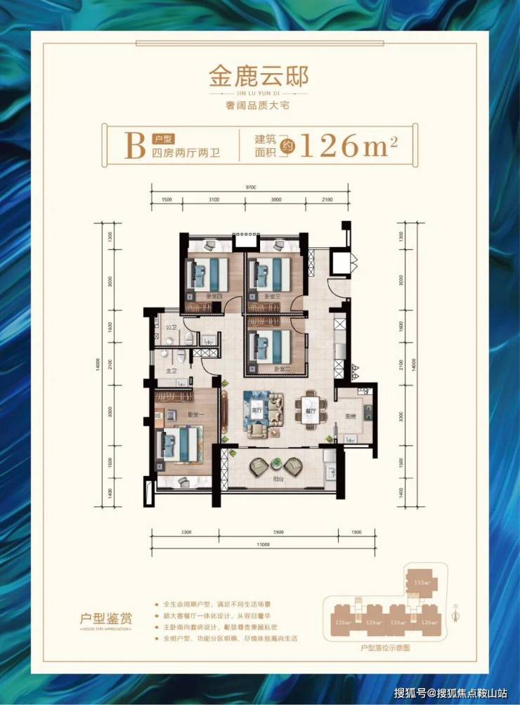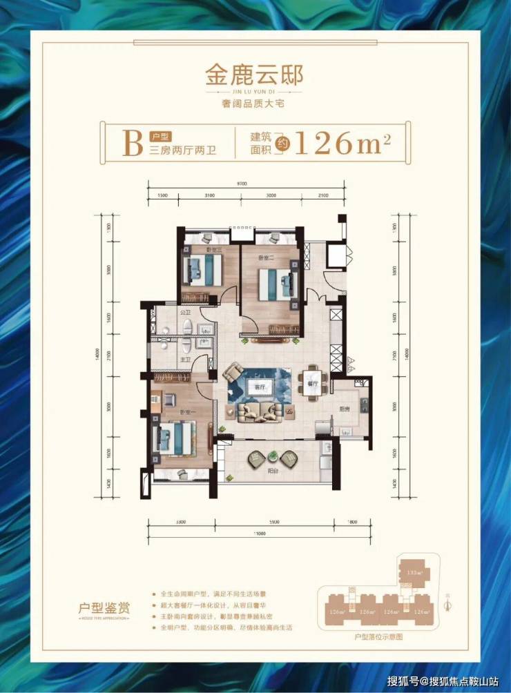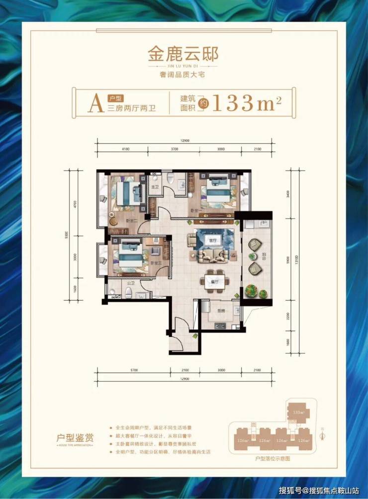 户型鉴赏建筑面积约126㎡-133㎡奢阔品质大宅;全生命周期户型,满足不同生活场景;超大客餐厅一体化设计,从容且奢华; 主卧套房精致设计,彰显尊贵兼顾私密;全明户型、功能分区明确、尽情体验高尚生活;•133㎡三房两厅两卫户型平面图