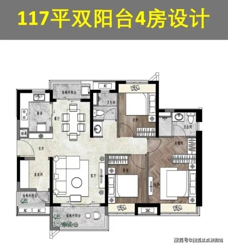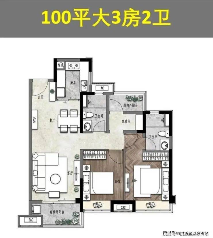 100平的竖厅户型,也是很普通了,就是90平的放大版,主卧更大了些。毫无特色或者卖点可言,但是也不能说户型设计不好, 就是这种感觉。