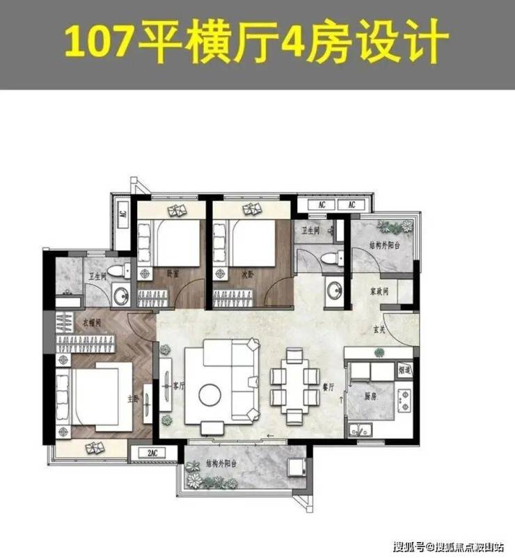 107平的相比之下就舒服很多了,单边位横厅,利用起来的空间还是相当大的,如果把中间的次卧打掉,变成竖厅加横厅就很完美了。这个户型还是能够拿出来比的。