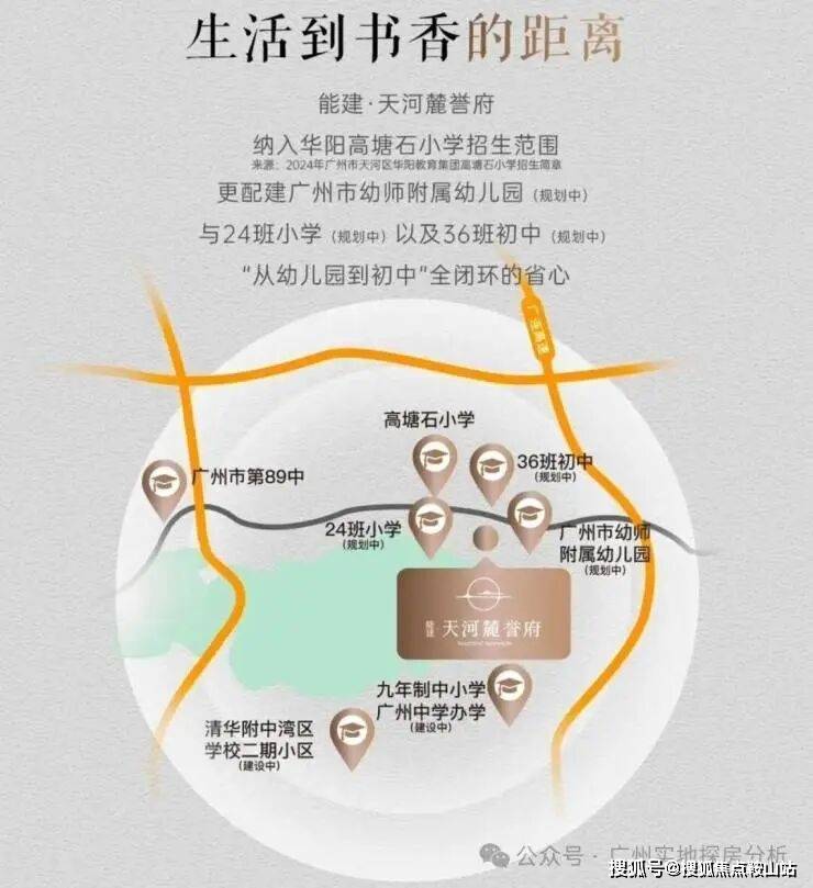 项目旁边有一所9班幼儿园,将由广州市幼儿师范学校附属幼儿园负责开办为新园区,还是省一级配置。社区斜对面是高塘石小学,目前是12个班,将在3年内扩建到24个班,已在去年官宣该校加入华阳教育集团,并由原华阳小学向其派出副校长和骨干教师团队进驻。初中2024对口直升是省一级中学89中,还可以摇号天河执信、天河湾区实验学校。