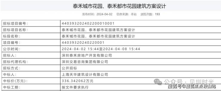 今年初,深圳公共资源交易中心发布了招标项目计划,将在2024年2月12日到2024年4月12日期间,对泰禾城市花园、泰禾都市花园项目建筑方案设计进行招标。