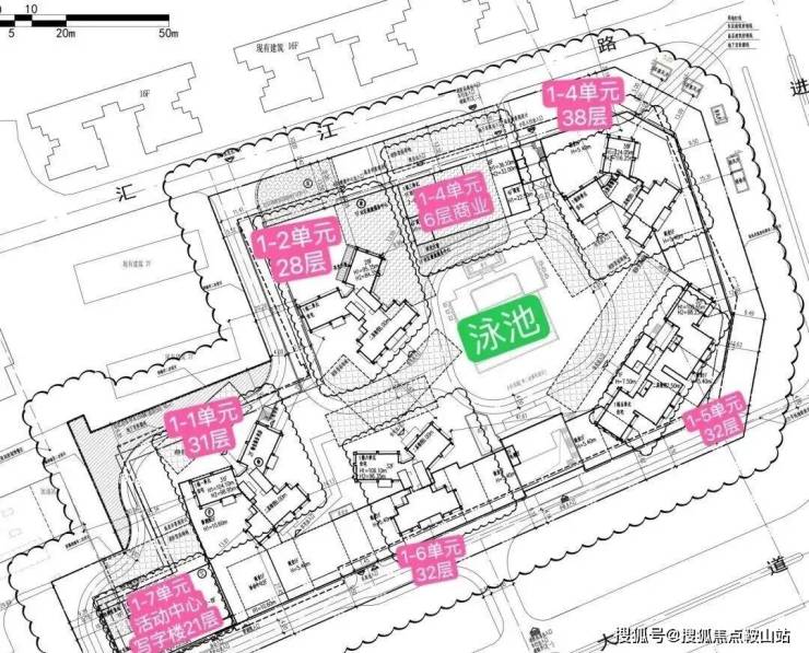 共规划建设7栋楼体,其中5栋为28-38层的高层住宅,共504户,均采用2梯4户或3梯4户的设计,另有1栋6层商业和1栋21层的办公产品,项目推出住宅产品为96-119㎡,以及133-170㎡的复式,此外小区内设有泳池配套。