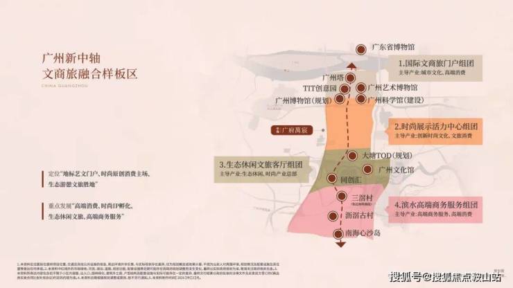 一轴三核规划,划分为四大板块:国际文商旅门户、时尚展示活力中心、生态休闲文旅客厅、滨水高端商务服务组团。国际文商旅门户已率先落地,1 塔 1 场 4 馆(广州塔、岭南广场、美术馆、文化馆、博物馆、科学馆)实景呈现。