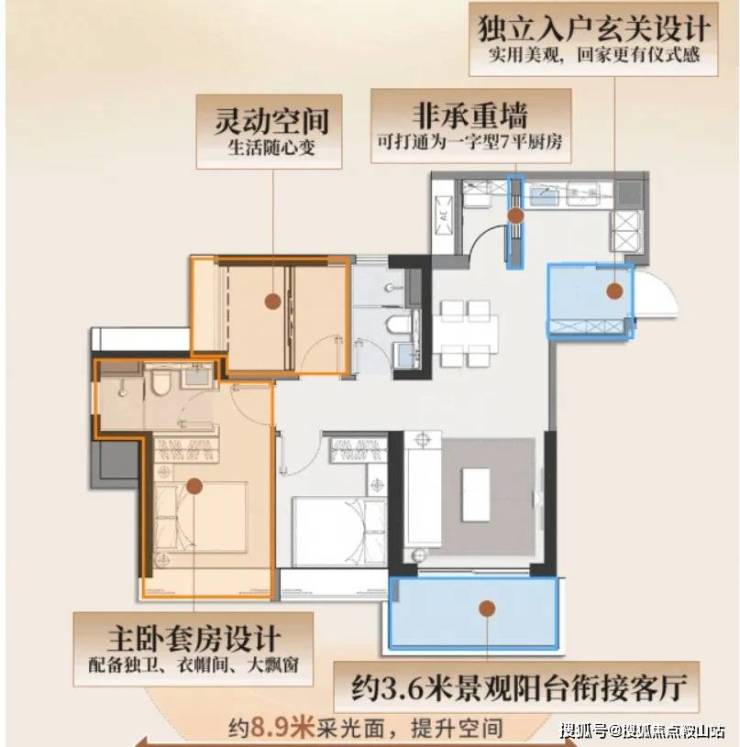 比如,采用少承重墙化设计,次卧可打通或隔开,生活阳台也能与厨房打通出7平全明空间。