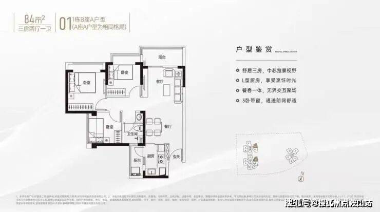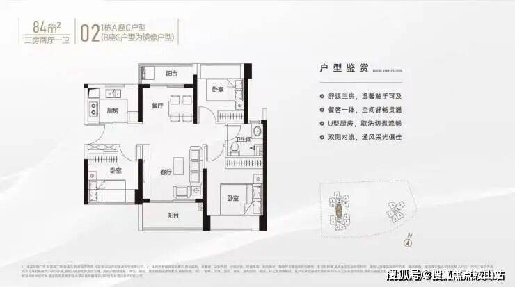 户型面积布局0284平三房两厅一卫设计的是竖厅南北通透格局,客厅3.4米开间,客餐厅双阳台分离化设计,U型厨房,卫生间干湿分离,得房率约79%(不含赠送),客厅阳台主朝东北向。