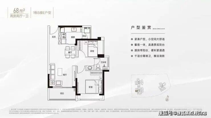 户型面积布局E68平两房两厅一卫设计的是竖厅格局,客厅3.4米开间,LDKB一体化设计,动静分区,L型厨房带1个生活阳台,卫生间三段式干湿分离,得房率约79%(不含赠送),西南朝向。