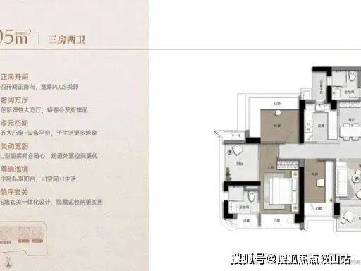 :流线型香槟金 + LOW-E 玻璃立面,王座塔冠;缦系 6 大创新:弹性方厅、环幕主卧、三面采光、多飘窗 + 设备平台,使用率超 90%。