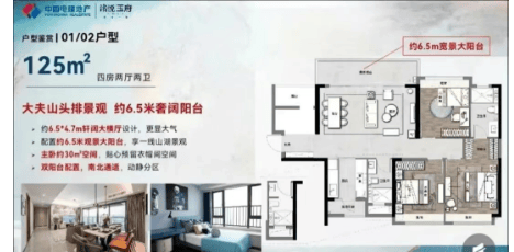 125㎡四房两厅两卫户型,采用正南北横厅设计,双阳台南北对流,超 6m 的超宽景观阳台,让住户能够尽情享受大夫山湖头排景观,为追求宽敞居住空间和优质景观的家庭提供了舒适的居住体验。