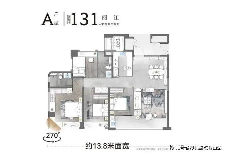 该户型也做了双套房设计,主人套房三面采光,同样拥有270°广角视野。