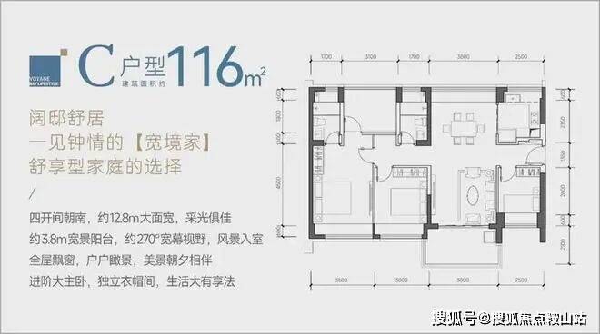 ②、116㎡的4房2厅2卫(C户型,分布在1/6B栋01户型,5/6A栋02户型,朝东南和西南向),竖厅南北通透户型格局,餐客厅一体化设计,客厅3.8米开间,四开间朝南,矮楼层看园林景观,高楼层看海景,得房率约:93.13%(包含赠送)。