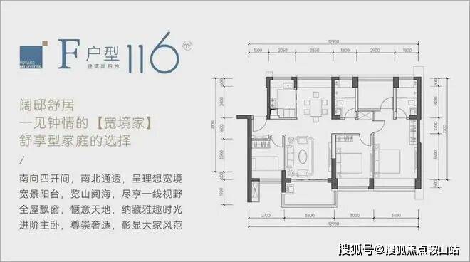 ③、116㎡的4房2厅2卫(F户型,分布在2栋02/03/04户型,朝东南和西南),竖厅南北通透户型格局,餐客厅一体化设计,客厅3.8米开间,四开间朝南,矮楼层看园林景观,高楼层看海景,得房率约:88%(包含赠送)。