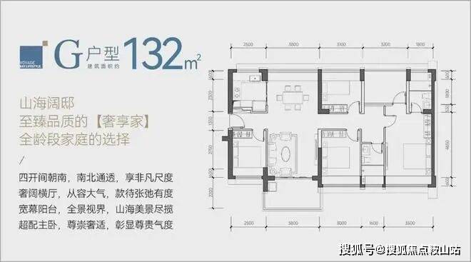 ④、132㎡的5房2厅2卫(G户型,分布在6B栋02户型,朝东南向),竖厅南北通透户型格局,餐客厅一体化设计,客厅3.8米开间,四开间朝南,得房率约:92.9%(包含赠送)。