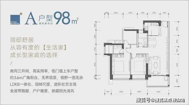 98㎡的3房2厅2卫(A户型,分布在1/5/6A/6B栋03/04户型,朝东南和西南向),传统的竖厅户型格局,厨房LDKB一体化设计,客厅3.6米开间,三开间朝南,矮楼层看园林景观,高楼层看海景,得房率约:89%(包含赠送)。