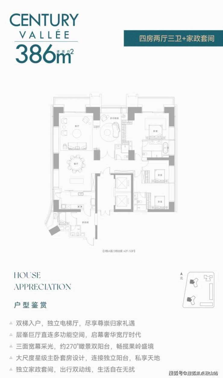 【约386㎡4+1房4卫】双梯入户,独立电梯厅,阔绰横厅直连多功能空间,三面舒适采光,主次卧双套房,270°环幕视野,还有独立家政套间,西朝向看名商高尔夫和大河沙生态长廊。
