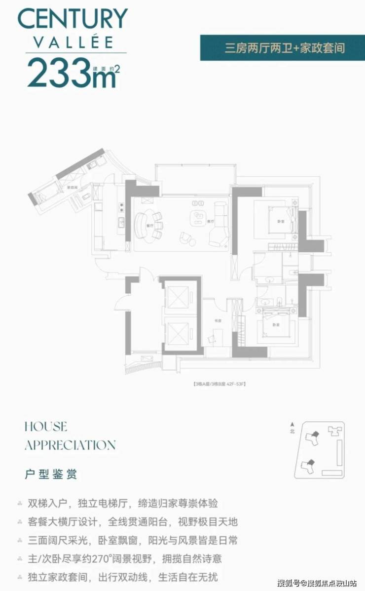 【约233㎡3+1房3卫】双梯入户,独立电梯厅,餐客大横厅贯通阳台,三面采光,主次卧尽享270°环幕视野,还有独立家政套间,西北朝向看名商和沙河高尔夫;