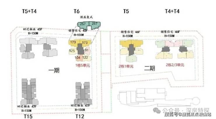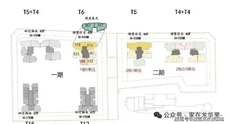 首推一期1栋5单元(45层),91-173㎡3-4房,共232套,以122-175平米4房为主,占比83%,还有两套257平顶复产品。173/257平大户型双电梯独立电梯厅入户,南区91-125平户型3梯4户。
