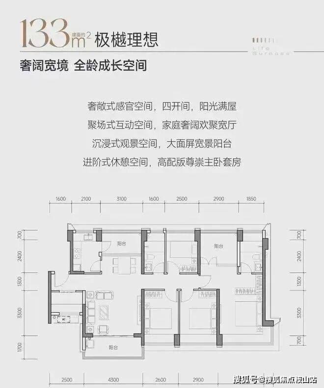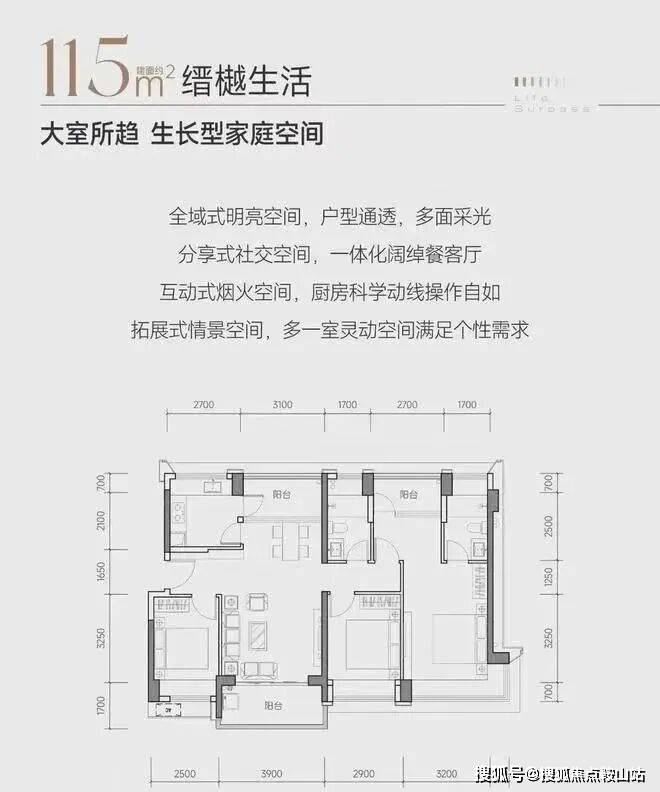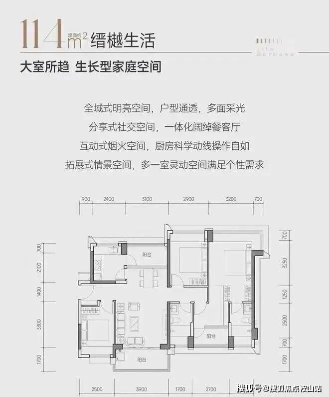 南山新房缙樾府的户型包括建面约 114㎡四房两厅一卫、约 115㎡四房两厅两卫、约 118㎡四房两厅两卫、约 133㎡五房两厅两卫。整个项目只有 2 栋相同平面的 100 米高纯商品住宅,十字型平面布局。114 - 115 - 118㎡四房各两条腿、133㎡五房 2 条腿,东南、西南朝向。全部为南北通户型,十字型布局使得户型采光通风非常好,但缺点是会有对视的情况存在。每户都存在通过阳台改造赠送的空间,改造后使用率基本接近 90%,属于市场上高拓产品。