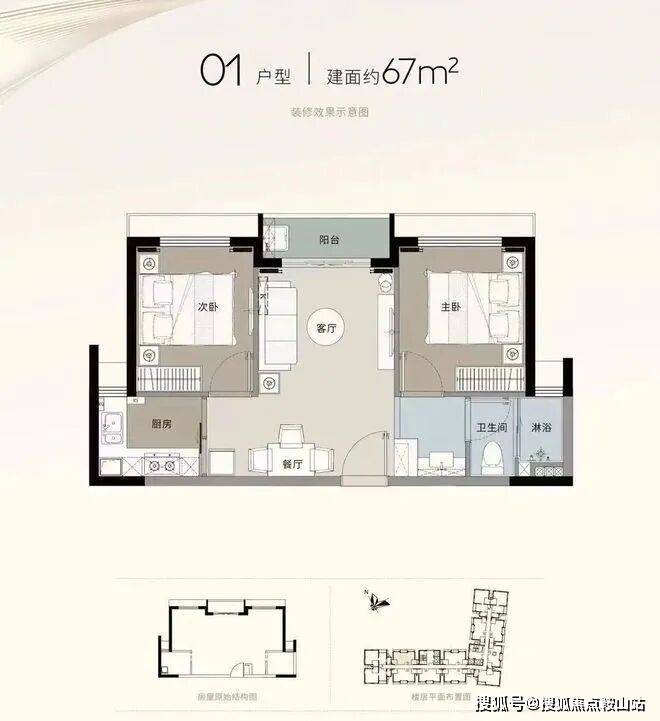 项目主推建面约67-79㎡实用户型,覆盖主流刚需需求。67㎡为温馨两房,格局方正、空间利用率高,适合单身人士与小两口居住;79㎡为实用三房,动静分区合理,能轻松满足三口之家居住,户户带观景阳台,采光通风俱佳,居住体验贴近普通住宅。