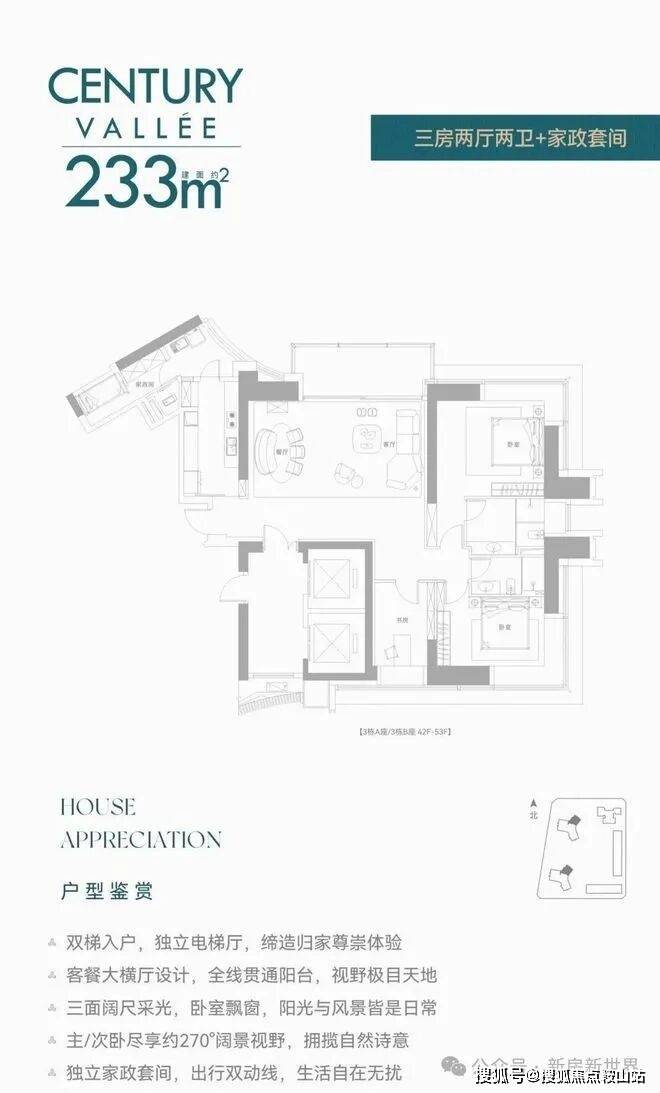 【约233㎡3+1房3卫】双梯入户,独立电梯厅,餐客大横厅贯通阳台,三面采光,主次卧尽享270°环幕视野,还有独立家政套间,西北朝向看名商和沙河高尔夫