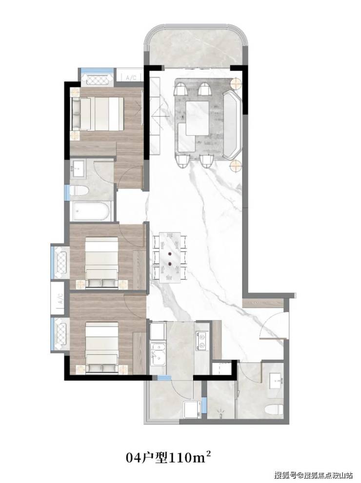 04户型:约110㎡,三房两厅两卫带主套