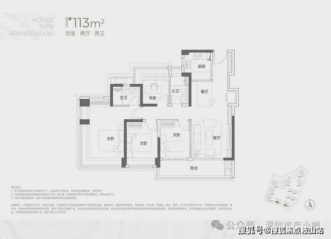 建面约113㎡ 四房两卫• 格局:竖厅布局,核心功能与110㎡一致,主打主卧空间升级。• 亮点:主卧可容纳大型衣柜,储物空间更充足;西南向直面山景,搭配隔音玻璃隔绝主干道噪音,大落地窗引景入室。