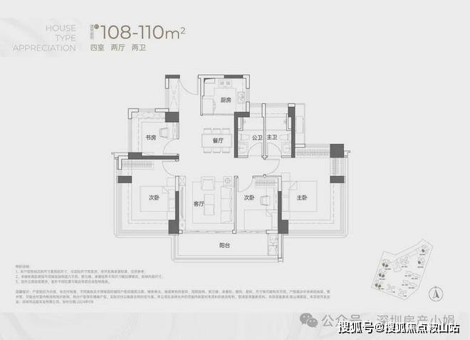 建面约110㎡ 四房两卫• 格局:竖厅+双龙抱珠设计,南北通透,动静分区合理,双卫紧邻更便捷。• 亮点:6.1米大阳台延伸景观视野,主卧与两个次卧均带270°飘窗,采光通风俱佳;东南向看小区花园,西南向远眺小南山,部分户型无遮挡观景。