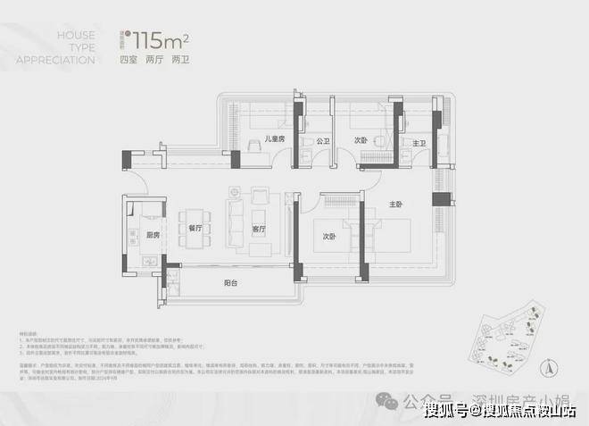 建面约115㎡ 四房两卫• 格局:横厅设计,三种户型贴合不同朝向,南北通透无遮挡,赠送率居首。• 亮点:餐客厅一体化,30㎡阔绰公共空间,搭配超大景观阳台;四开间朝南,全屋采光均匀,主卧套房设计,私密度拉满。