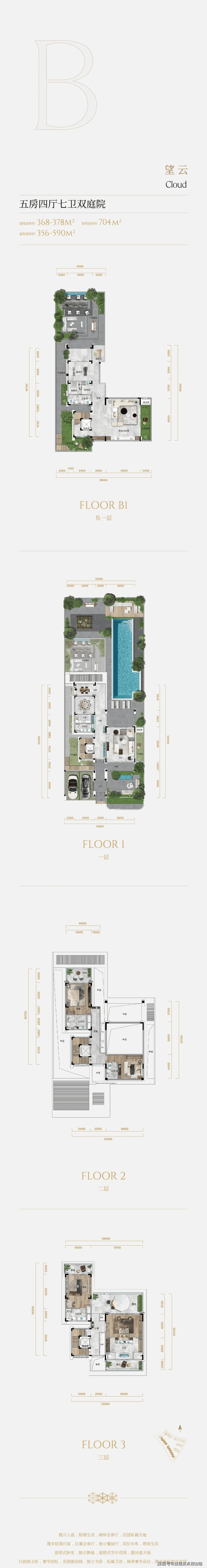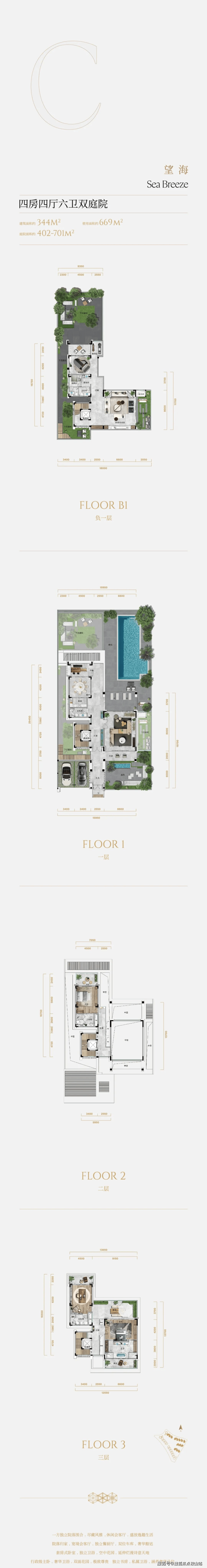 「山海之间 千平大院 独栋别墅」建面约344-445㎡独栋,千平大院的传世藏品①超低密规制,约0.3容积率②层层阔绰花园,无界度假风情③行政级主卧,奢华规制私密静逸
