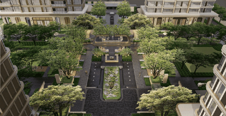 下沉庭院、中轴园林、架空层泛会所、门堂院落、空中花园