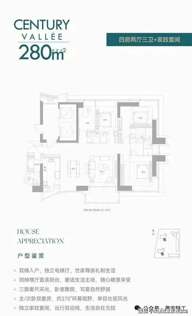 【约233㎡3+1房3卫】双梯入户,独立电梯厅,餐客大横厅贯通阳台,三面采光,主次卧尽享270°环幕视野,还有独立家政套间,西北朝向看名商和沙河高尔夫