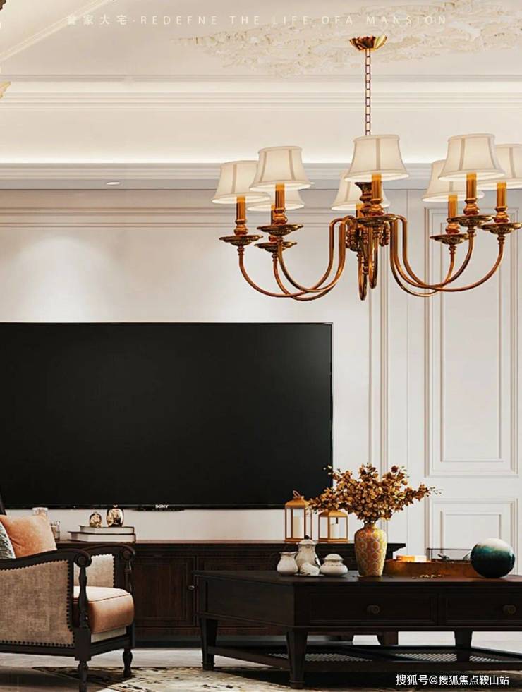 美式沙发、黄铜水晶吊灯、复古镜面与艺术挂画,点缀其间,仿佛不经意间诉说着一段关于艺术与时光的故事。阳光透过轻纱帘洒入,整个空间笼罩着一层温柔滤镜。