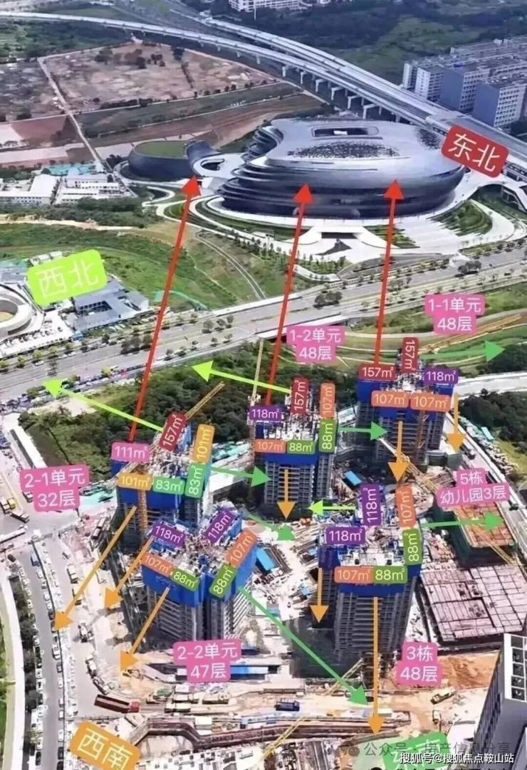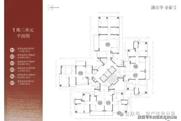 本次推售的是满京华金硕悦府,共由5栋32-48层高的住宅组成,其中1栋1/2单元住宅48F,2栋1单元住宅32F,2栋2单元住宅47F,3栋住宅48F,4栋是1所幼儿园,还配建有社区菜市场,总规划1186户,其中2栋1单元2梯6户,1栋1单元楼王3梯5户,其它栋数全部3梯6户设计。