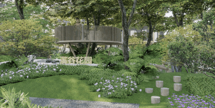 整个滨水园林包括了5大功能区,主入口的林溪港湾、拾阶云台、漂浮会客庭院、亲子儿童乐园(即溪谷花园)、配置羽毛球和篮球场的悦动之港,真正做到了一步即一景。