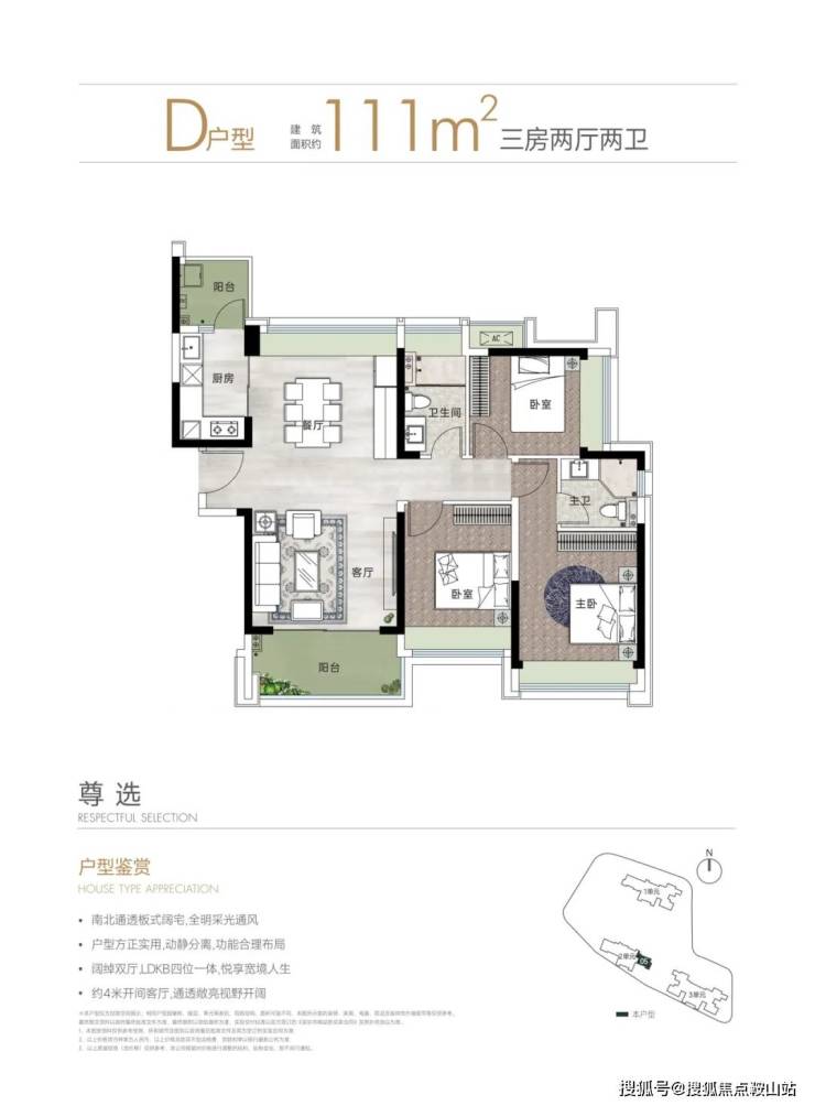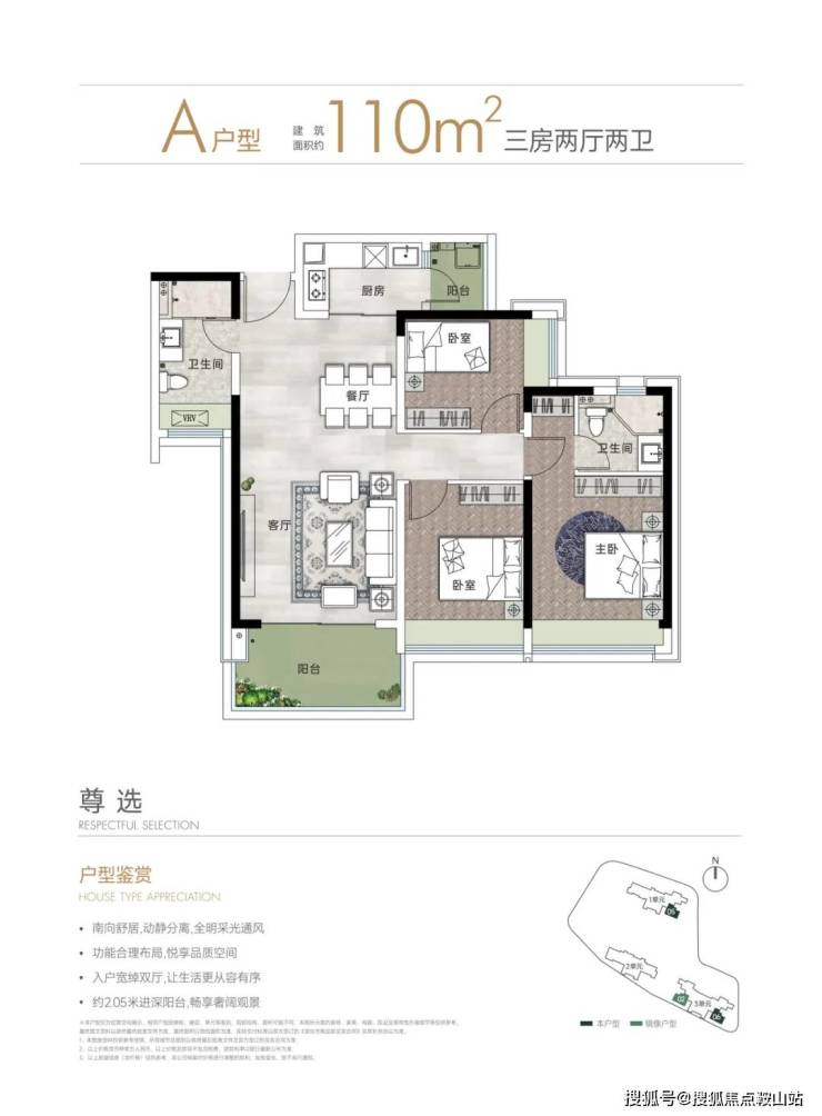 主力户型为建面约90/110㎡的A/B户型,全系采用全尺寸飘窗/转角飘窗和大阳台配置,充分发挥景观优势。