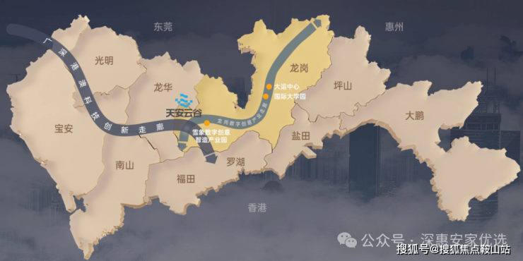 作为坂田北最大体量旧改项目,天安云谷位于坂田街道冲之大道和坂李大道的交汇处,毗邻地铁22号线岗头北站(建设中)。项目占地面积约13.14万㎡,由8个地块组成,建面约128万㎡,集产业、办公、居住、商业等于一体。其中,三期是天安云谷首个包含住宅的项目,建成后将有21栋住宅+2栋酒店+2栋公寓办公,预计提供住宅5886套,保障房640套。