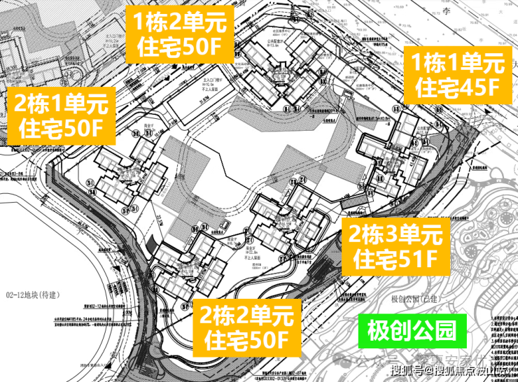 本次首推的天安1号,也就是2-01地块,由天安集团打造,总占地面积约2.5万㎡,总建筑面积约24.44万㎡,计容建筑面积约17.51万㎡,容积率6.32,绿化率40%,共由5栋45-51层高住宅组成,其中1栋1单元住宅45F,1栋2单元住宅50F,2栋1单元住宅51F,2栋2/3单元住宅50F。