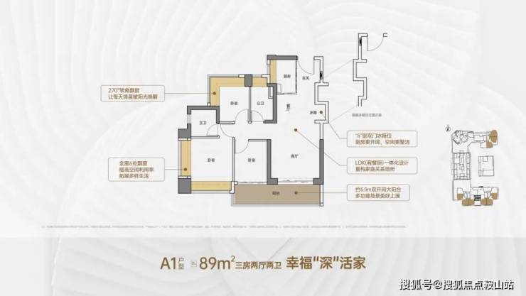 89㎡的3房2厅2卫,A1户型,设计的是竖厅格局,客厅3.5米开间,LDKB一体化,S墙设计预留冰箱卡槽位,客厅连接次卧出5.9米长的大阳台,主卧双面飘窗,次卧270度转角飘窗,U型厨房,卫生间干湿分离,得房率约72.57%(不含赠送),阳台有朝西向、东向、南向。